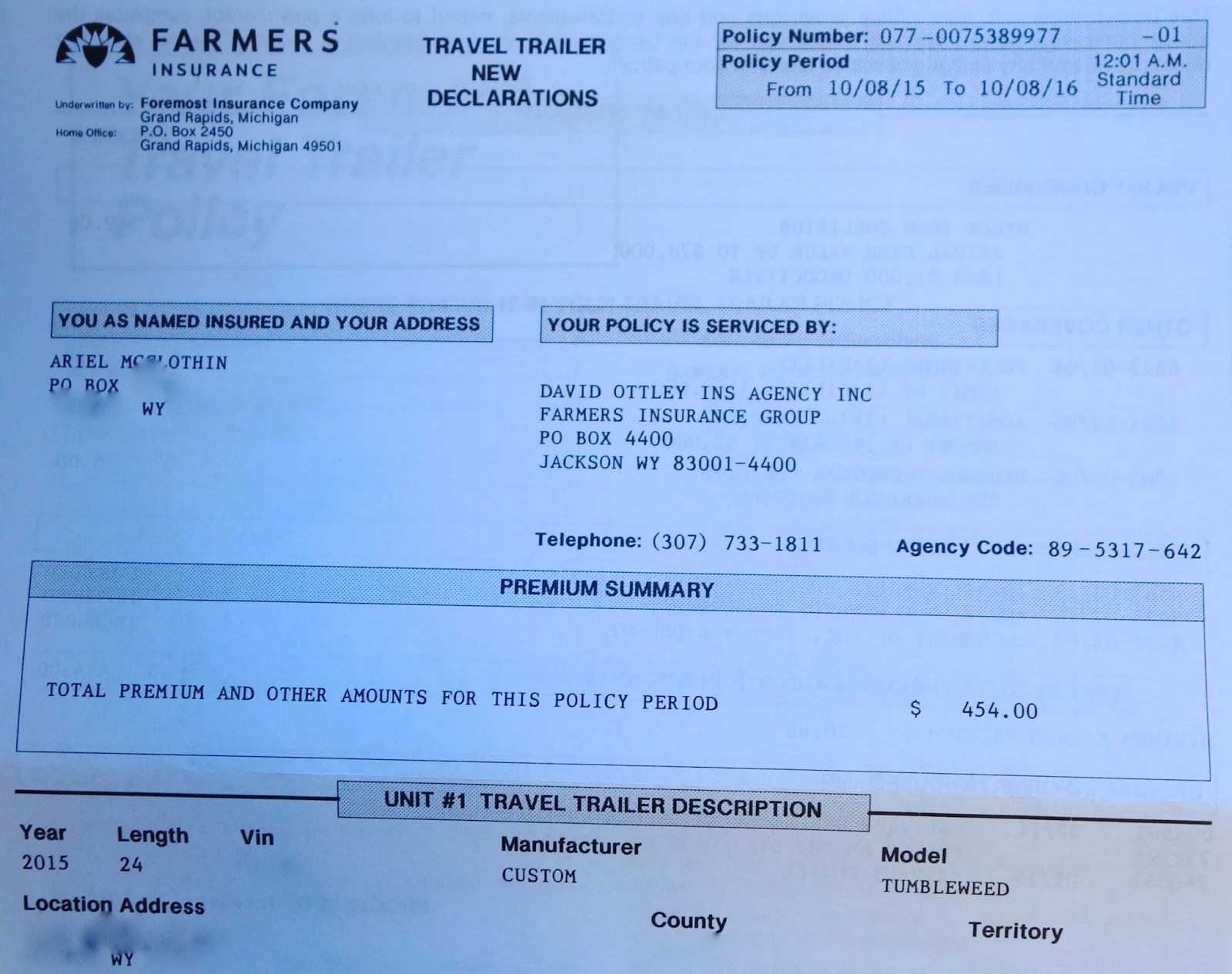 I tried to get as many details from the company as I could to give you all as much helpful info on this as possible. I know there are many others looking for insurance as well. This particular policy was available to me since I have a house built by Tumbleweed and they have an RVIA certification. One of the pluses of having purchased a prebuilt house by a well known name. Of course, it would be way cooler to say I built it myself, but there are some pluses on the other side as well. Famers did need the VIN and RVIA numbers from my trailer. I assume this would have worked if I had a house built by any other RVIA manufacturer. I'm not sure what would have happened if I had a home I'd build from scratch by myself. They may have insured it as well, I'm just not sure. Below is a copy of my new policy, just with some of my personal details blocked out.